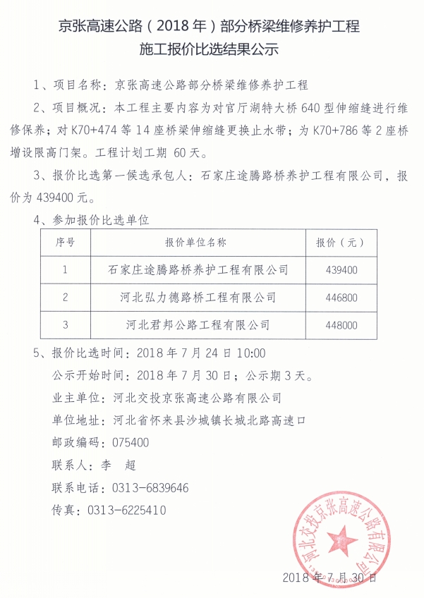 京張高速公路(2018年)部分橋梁維修養(yǎng)護工程施工報價比選結(jié)果公示
