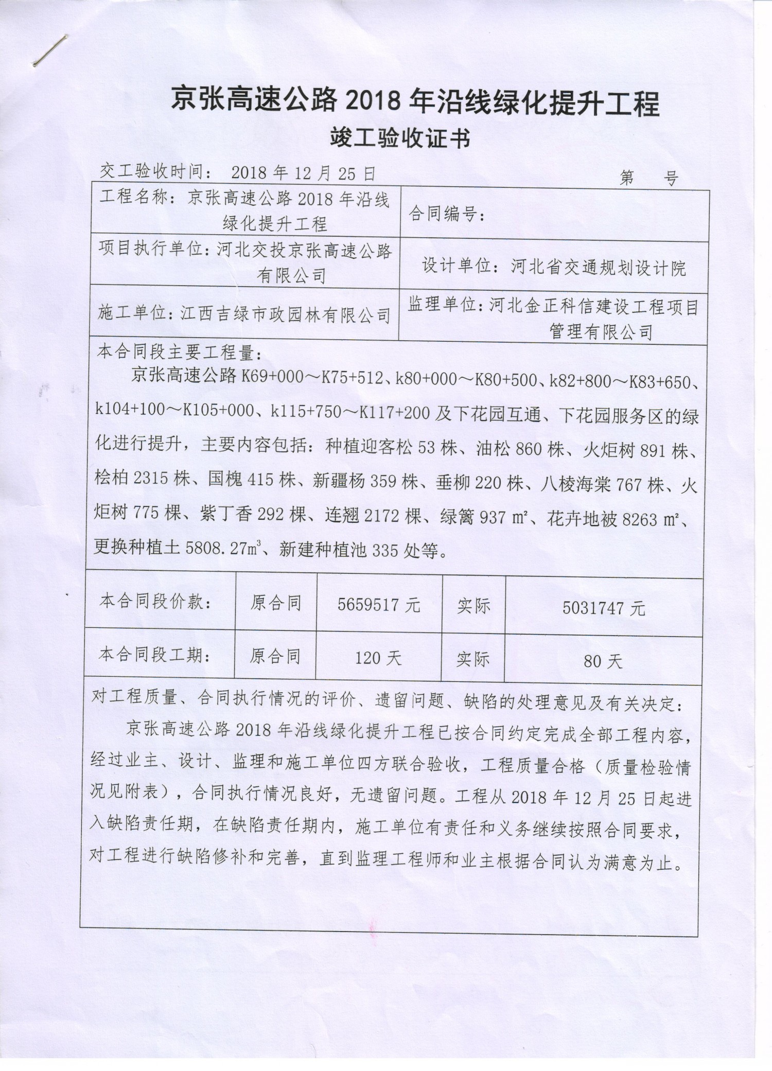 京張高速公路2018年沿線綠化提升工程竣工驗(yàn)收證書(shū)