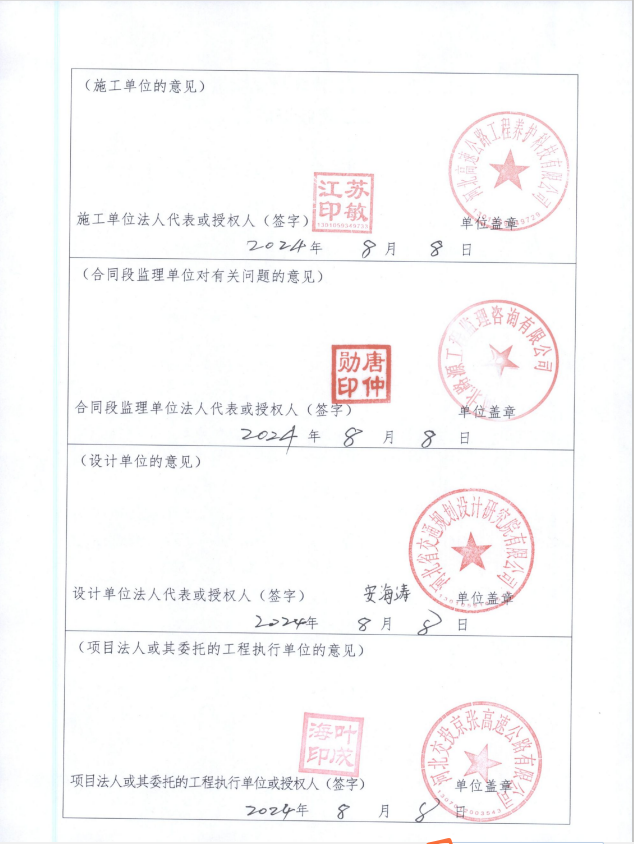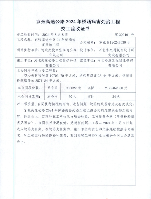 京張高速公路2024年橋涵病害處治工程交工驗(yàn)收證書